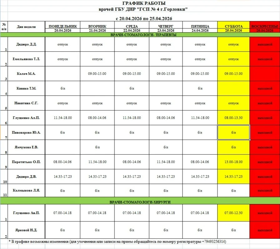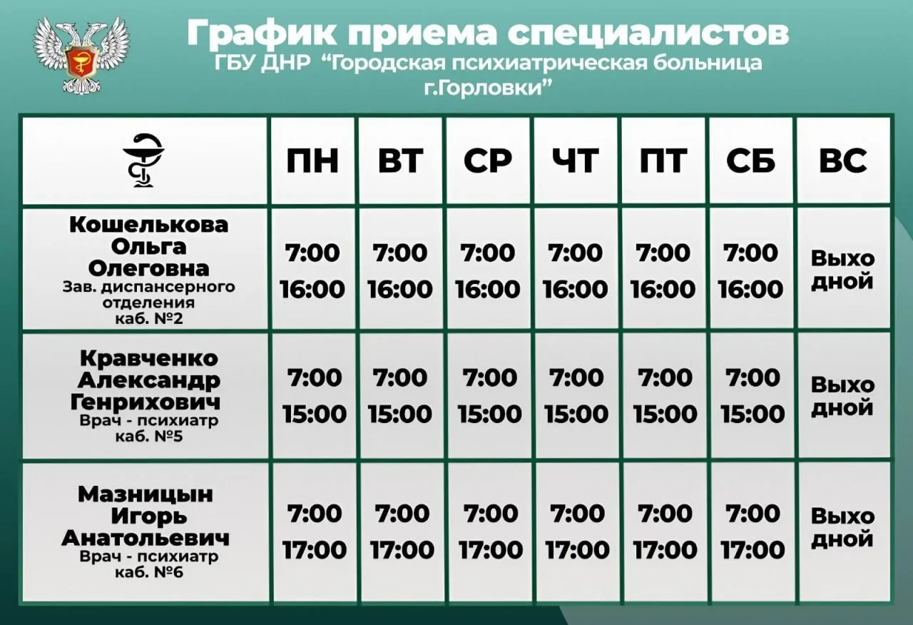 Иван Приходько: График работы специалистов ГБУ ДНР «ГДСП г.Горловки», ГБУ ДНР «Городской наркологический диспансер г. Горловки», ГБУ ДНР «ГПБ г. Горловки», ГБУ ДНР «ГПТД г.Горловки», ГБУ ДНР «ГДВД г.Горловки», ГБУ ДНР «ГСП...