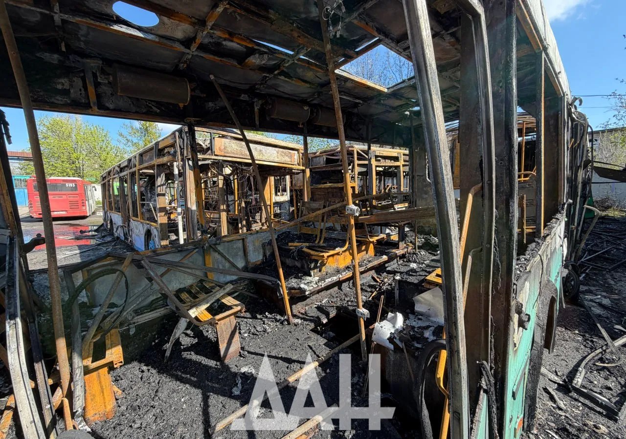 Из-за обстрела начался пожар, в котором семь автобусов сгорели полностью, еще два — повреждены: у них обгорели борта и выбиты окна.