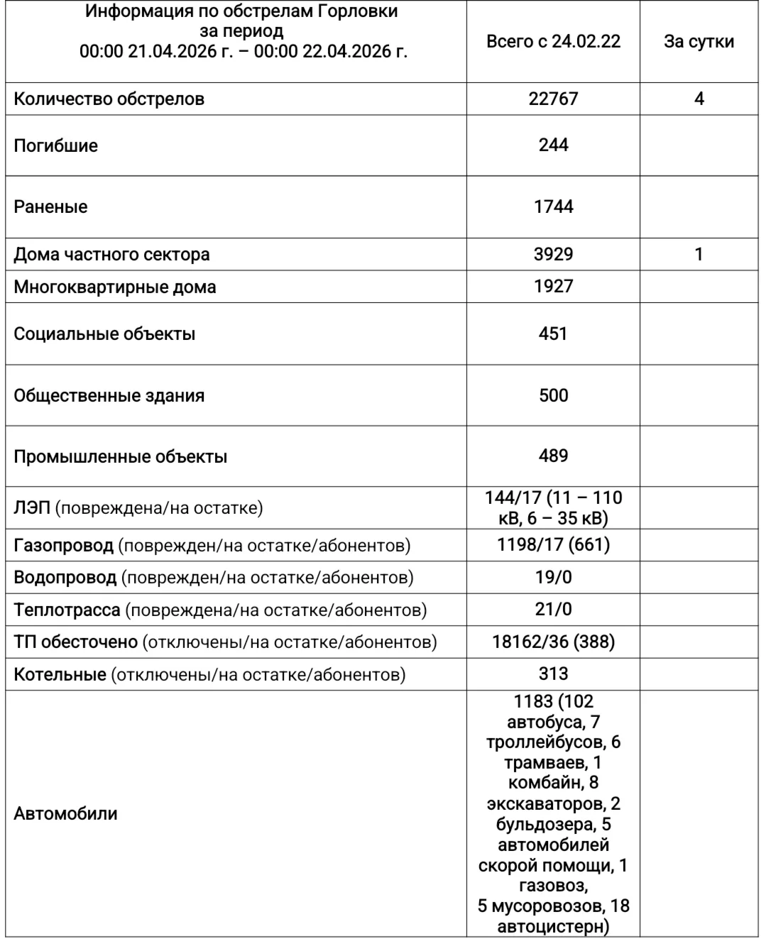 Информация по обстрелам Горловки с 00:00 21.04.2026 г. по 00:00 22.04.2026 г.